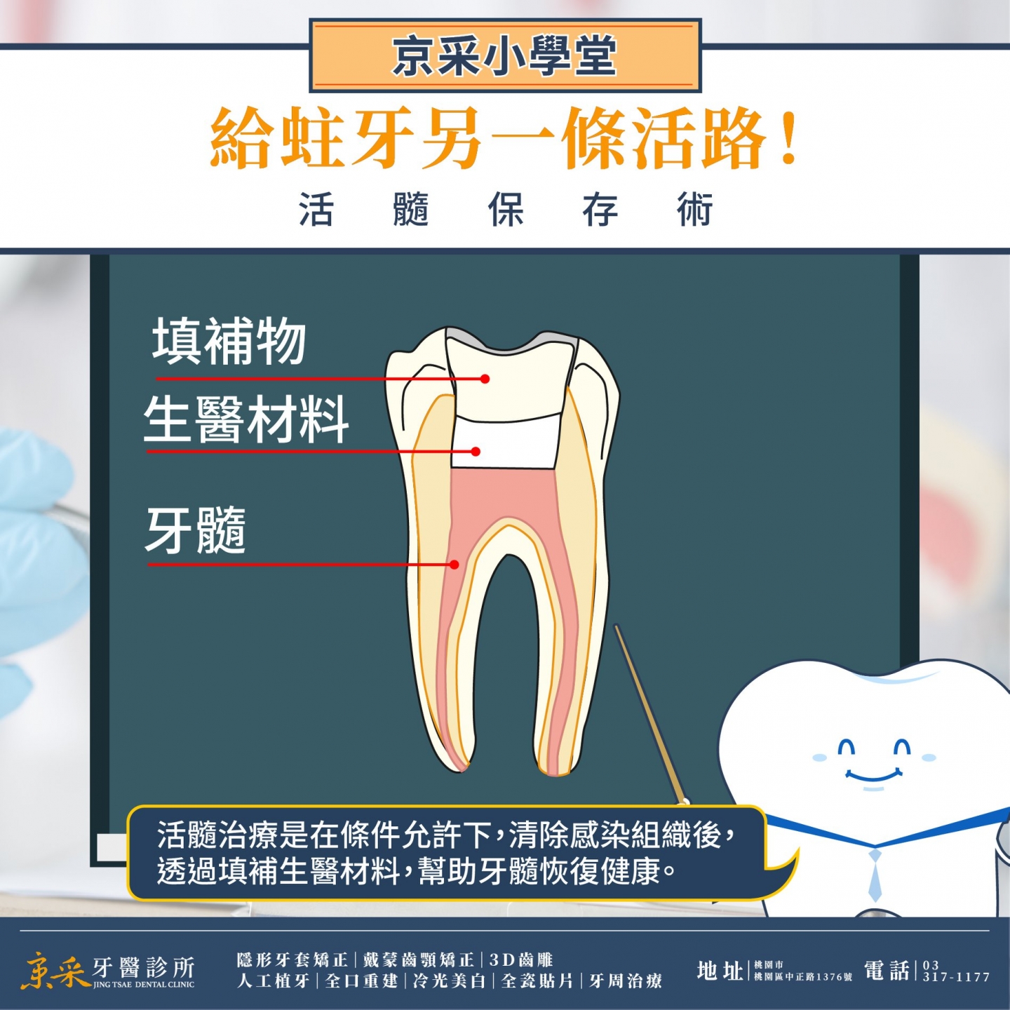 但不是所有蛀牙都可以使用活髓保存治療,這需要縝密評估牙髓組織的感染程度,越乾淨的牙髓組織越有機會留下,所以如果發現牙齒有異狀,還是讓我們觀察評估一下,再一起討論適合的治療計畫吧!
