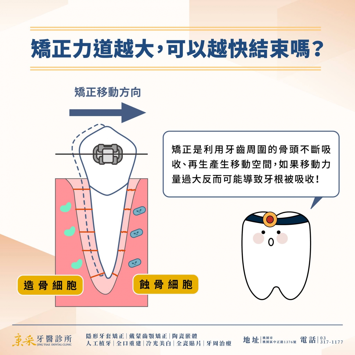 蝕骨細胞是吃骨頭細胞,當矯正的力量適當時,可以刺激蝕骨細胞活化,但若力量過大,則同時會刺激活化另一種「吃牙齒的細胞」(噬齒細胞),最後可能導致牙根變短甚至被吸收
