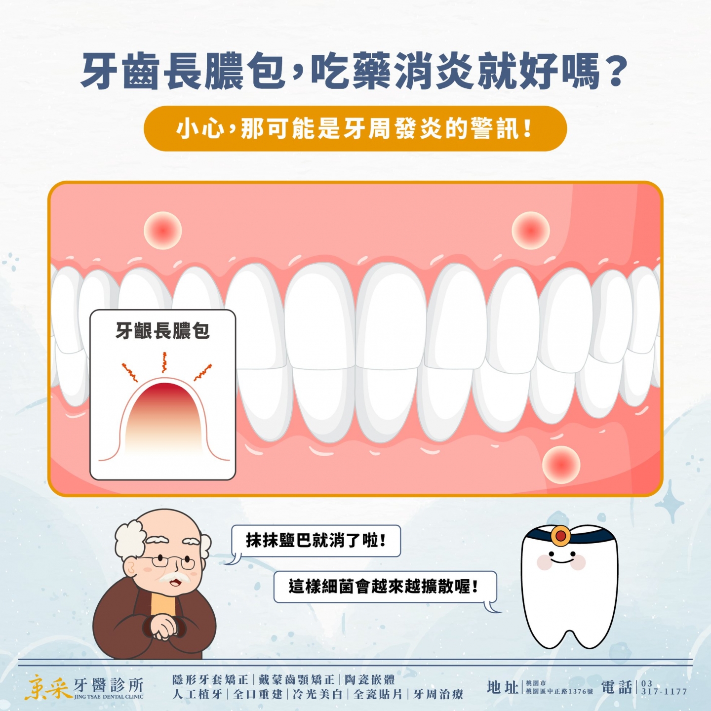 消炎藥頂多是抑制當下的發炎反應,就算膿包看起來消失了,但是並沒有從根本解決導致牙周發炎的問題哦!